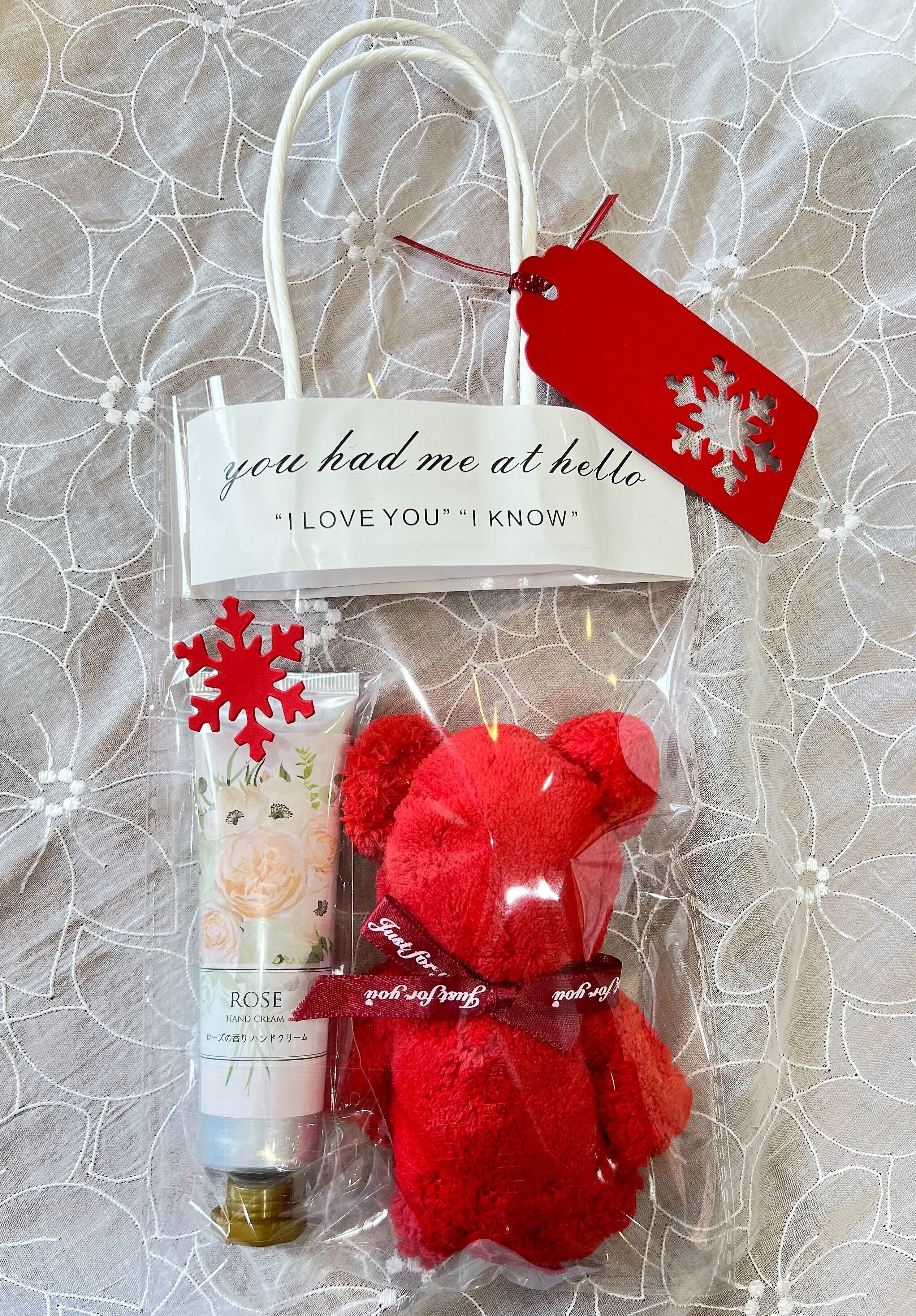 くまちゃんの形にラッピングした吸湿性の高いハンドタオルとエレガントハンドクリームをセットにしました。 季節を感じるギフトタグとメタリックタイ、おしゃれな手さげをお付けしてお届けします。